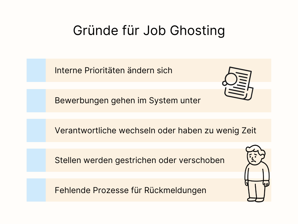 Das Phänomen kann in unterschiedlichen Phasen des Bewerbungsprozesses auftreten: unmittelbar nach der Bewerbung, nach einem Telefonat, nach einem persönlichen Gespräch oder sogar, nachdem dir bereits eine positive Rückmeldung gegeben wurde.
